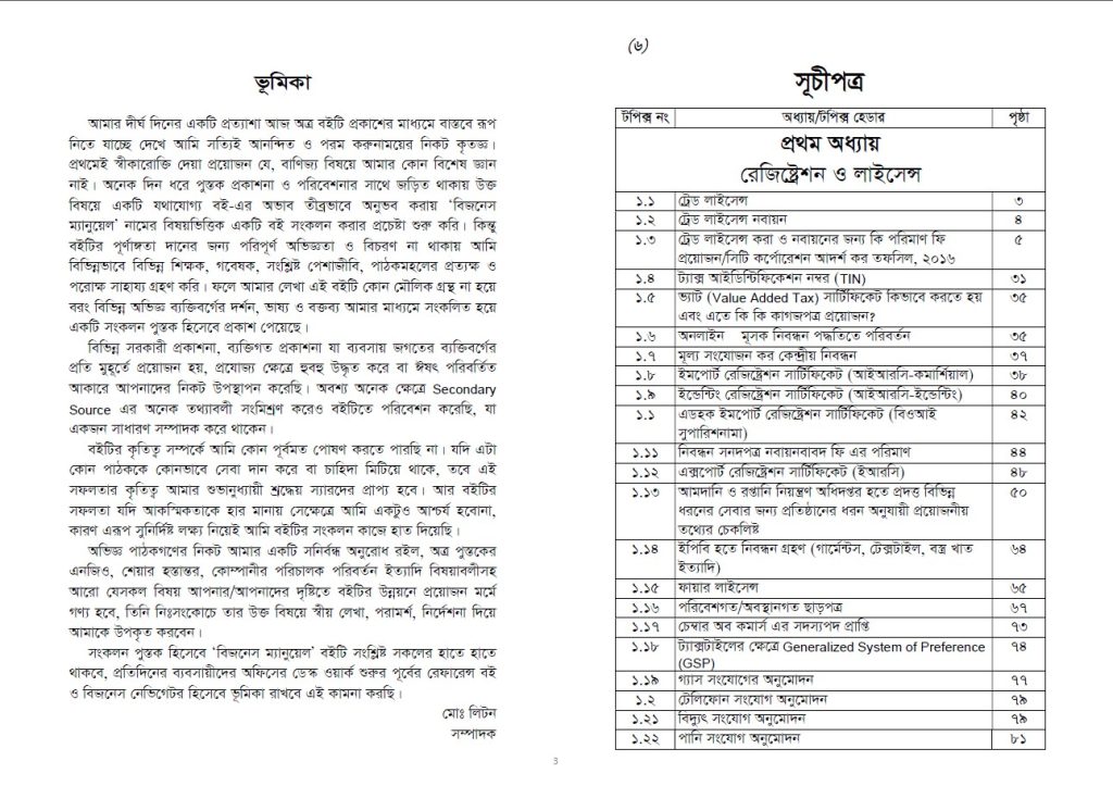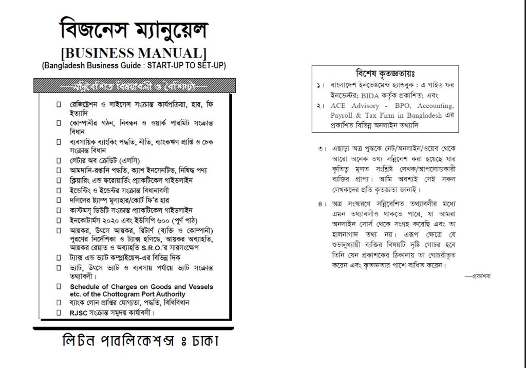 “Business Manual – Bangladesh Business Guide: Start-up to Set-up” বইটি হলো বাংলাদেশের ব্যবসা শুরু ও পরিচালনার সবচেয়ে পূর্ণাঙ্গ গাইড। এখানে পাবেন RJSC কোম্পানি রেজিস্ট্রেশন, BIDA, TIN, VAT, BIN, Licensing, Import–Export, Banking, LC, Customs, Duty, HS Code, Indenting Business, C&F Rules, SME Loan Guidelines এবং Incoterms 2020 সহ ব্যবসায়িক সকল প্রয়োজনীয় তথ্য। নতুন উদ্যোক্তা, ব্যবসায়ী, একাউন্টেন্ট, কনসালটেন্ট ও শিক্ষার্থীদের জন্য অপরিহার্য।