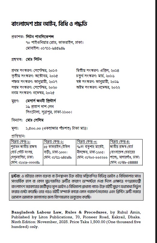 এই বইটি বাংলাদেশে শ্রম আইন অধ্যয়ন, পরীক্ষা প্রস্তুতি, গবেষণা ও পেশাগত ব্যবহারের ক্ষেত্রে সর্বাধিক নির্ভরযোগ্য গাইড হিসেবে কাজ করবে।